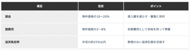 諸費用については、印紙税、登記費用、ローン関連手数料、保険料などが含まれ、物件価格の3~8%程度を目安に準備しておくことが望ましいです。