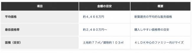 東住吉区で戸建て購入を考えるファミリーに向けた、返済シミュレーションの考え方東住吉区における新築建売の平均価格は、約4,466万円で、価格帯は幅があり、ご家族のご予算に応じた選択肢が用意されています。たとえば、比較的手頃な価格帯として2,480万円からという物件もありますので、無理のない借入額のイメージを立てやすくなっています。なお、平均の土地面積は約77㎡、建物面積は約103㎡、間取りは4LDKが多く、ファミリー層に適した住空間です。