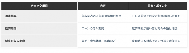 借りすぎを防ぐためのチェックポイントを以下の表にまとめています。返済比率(返済負担率)は年収に対して20%前後が目安とされ、返済期間が短いほど月々の負担は増えるため、バランス調整が重要です。また、将来の収入変動や家族構成の変化も想定して、余裕を持った借入と返済計画を立てましょう。