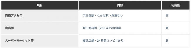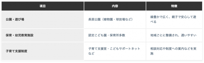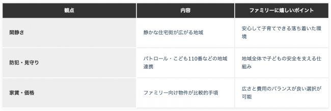 以下に、三つの観点から住環境の魅力を表にまとめます。