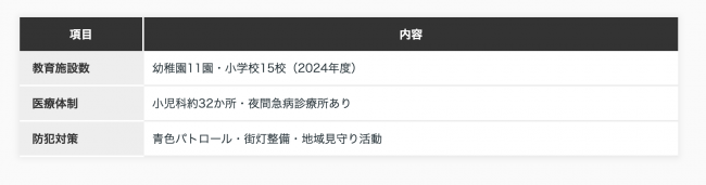 加えて、地域ぐるみの防犯活動が盛んで、青色パトロールや子どもの見守り隊など、行政・住民・警察が連携した取り組みが展開されています。街灯の整備も進んでおり、夜間の帰宅も安心です。そうした安全性への配慮が、子育て世帯から高い信頼を得ています。