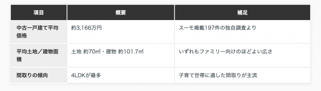 さらに、SUUMOによると、売却価格相場の中央値は約2,880万円、中央値の建物面積98㎡、土地面積61㎡、築年数29年という傾向もありました 。