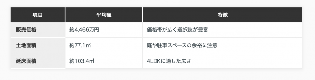 物件の間取りは四LDKが最も多く、家族がゆったり暮らせる空間が重視されています。また、平均的な土地面積は七十七・一平方メートル、建物の延床面積は百三・四平方メートルほどで、ファミリーにとって十分な広さが確保されている傾向があります 。