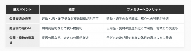 以下に交通アクセスと周辺環境の魅力をまとめた表をご紹介します。
