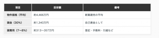 次に購入時にかかる諸費用についてです。新築一戸建て購入時には、物件価格の7~8%程度が諸費用として必要になることが一般的です。例えば、価格が4,466万円の場合は諸費用が約313万円~357万円ほどになる計算です。これに加えて、頭金として物件価格の約30%(約1,340万円程度)を用意できれば、より無理の少ない資金計画が可能です。