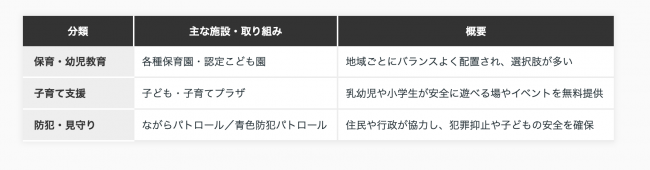 以下の表は、子育てファミリーが知っておきたい主な施設をまとめたものです。