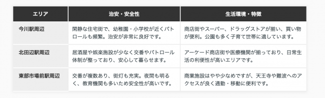 上記表に加え、エリア選びで重視したいポイントをご紹介します。アクセス面では、どの駅も天王寺や難波への移動がスムーズで、通勤・通学にも好都合です。特に東部市場前駅は天王寺駅まで約3分、難波駅までは12〜13分と利便性が高い点が魅力です。