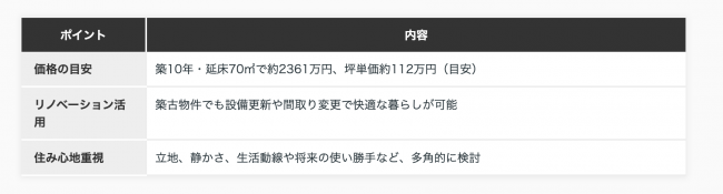 ご家族のライフスタイルに応じた住まい選びにあたっては、価格や設備だけでなく、住み心地を重視する視点も大切です。例えば、駅近で通勤・通学に便利な立地、静かな住宅街での生活、駐車スペースやお庭の有無、リノベーションによる間取りの柔軟性など、家族構成や将来的な子育て、在宅ワークなどを見据えた多様な視点で検討することをおすすめします。