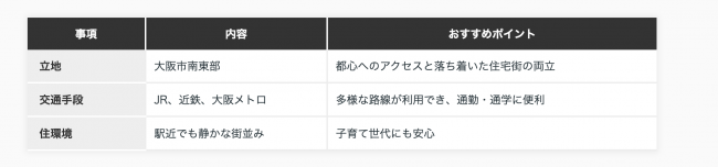 複数の交通手段が利用でき、JR関西本線、近鉄南大阪線、大阪メトロ谷町線などがとても便利です。これにより都心への通勤・通学が快適で、駅近でも静かな住環境が実現しています。