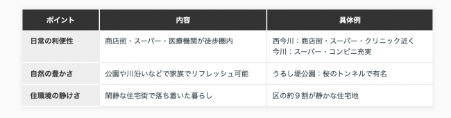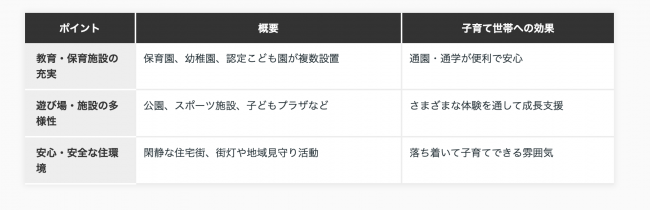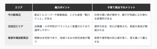 以下に、各エリアごとの特徴と子育て世帯に支持される理由を表にまとめました。