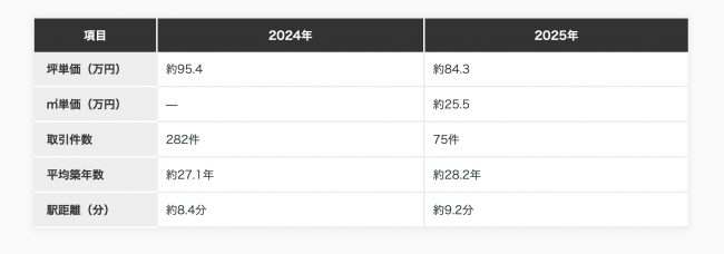 これら価格変動の要因としては、取引件数の減少だけでなく、築年数の傾向も影響しています。実際、平均築年数は2024年の27.1年から2025年には28.2年へと増加しており、やや築年数が進んだ物件が多く取引されている可能性があります。駅までの距離も平均で8.4分から9.2分へと延びており、利便性が多少低下していることも価格に影響を与えていると考えられます。