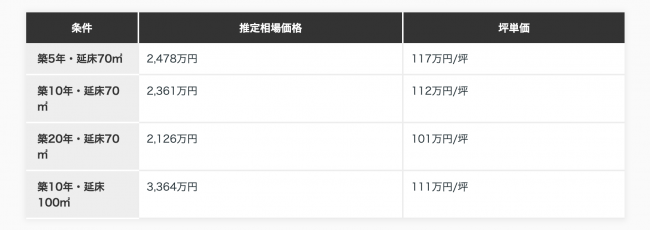 さらに、LIFULL HOMEʼSでは築年数別および延床面積別の相場が示されています。築10年の延床70㎡での売却想定相場は約2,361万円で、坪単価は約112万円です。築年が浅いほど相場が高く、例えば築5年では約2,478万円(坪単価約117万円)、築20年では約2,126万円(坪単価約101万円)となっています。また、延床面積別に見ると、100㎡では約3,364万円という相場も把握できます。