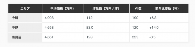 このように、今川では平均価格が約5,000万円、坪単価112万円で件数190件、前年比増加率+6.8%と堅調な動きを示しています。また、中野も平均価格約4,658万円、坪単価83万円、件数120件、前年比+14.0%と上昇基調です。南田辺は平均価格4,661万円、坪単価128万円、件数223件と取引件数が多く、価格は横ばいの傾向です。その他、住道矢田や公園南矢田などでは、比較的価格が抑えられている地域もありますが、ここでは代表的な三地域に絞ってご紹介しました。
