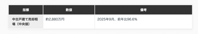 直近の成約データを見ると、SUUMOによれば2025年9月時点の東住吉区全体での中古戸建て売却相場は約2,880万円(建物面積中央値98㎡、土地面積中央値61㎡、築年数中央値29年)となっています。また、この価格は前年および前月比いずれも96.6%の水準で推移しており、若干の値下がり傾向が伺えます。