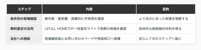 以下に、相場把握から行動につなげる流れをまとめた表をご用意いたします。