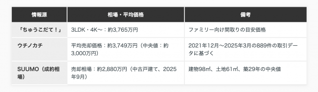 一方で、SUUMOの売却価格相場(2025年9月分)では、おおむね2,880万円とされ、中央値の建物面積98㎡、土地面積61㎡、築年数29年という条件で算出されています。これは、広さや築年次が異なる場合の参考値として重要です。