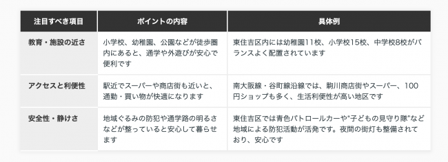 これらの要素を物件選びでチェックする際、例えば「小学校までの距離」「最寄り駅やスーパーまでの所要時間」「地域の防犯状況」などを基準にすることで、ご家族にとって最適な住まいを見つけやすくなります。