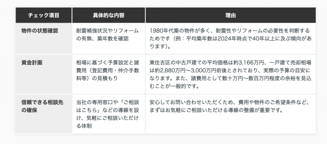 中古戸建て探しを成功させるために押さえたいポイント 東住吉区でファミリー向け中古戸建てをお探しになる際、安心して検討いただけるよう、以下の3つの視点を重視していただくことが大切です。