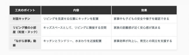 これらの工夫が備わった間取りは、家事の負担を軽減するだけでなく、子どもを見守りながら家事を進めやすい環境づくりにもつながります。移動距離を減らし、時間を効率的に使える設計は、育児中の暮らしに安心とゆとりをもたらす大切な要素です。