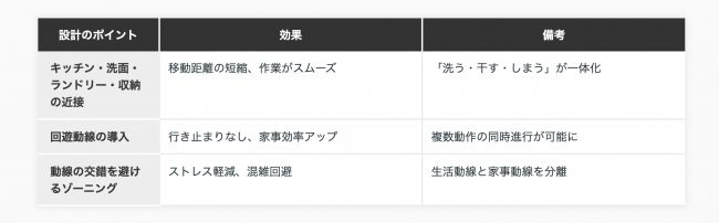 まず、キッチン・洗面・ランドリールーム・収納などを近接配置することで、家事に伴う移動距離を最小限に抑えられます。たとえば、洗濯機から干す場所、さらに収納スペースへとスムーズに動ける動線は、作業の効率を高めます。これにより、家事にかかる時間と身体的負担が軽減され、育児との両立がより楽になります。実際に、水回りをまとめることで「洗濯・干す・しまう」が一体化するレイアウトは、子育て世帯で支持されています。