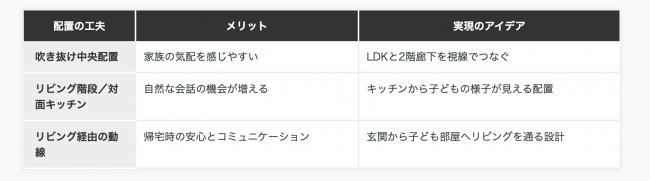 また、リビング階段や対面キッチンの導入も有効です。リビング階段により、子どもが部屋に行く際に自然なコミュニケーションの機会が増え、対面キッチンでは家事をしながら子どもの様子を見守ることができます。こうした配置は、家族のつながりを日常の動線に取り入れる効果があると言えます。