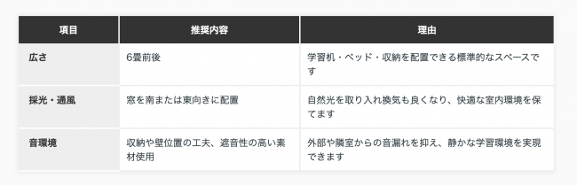 これら3つの要素、「広さ」「採光・通風」「音環境」にバランスよく配慮することで、子供部屋がただの居室ではなく、学びと成長にふさわしい快適な空間になります。