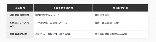 (例:広いフリースペース→可動棚やパーテーションで仕切ることで将来の個室に対応)