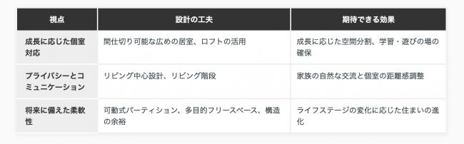 最後に、将来的なメンテナンス性や安全対策も見逃せません。バリアフリー設計や、家具配置を想定した動線づくりは、子育て期だけでなく将来の住まい方にも対応できる柔軟性をもたらします。耐久性の高い素材を選ぶことで、長期的な修繕コストを抑えるメリットも得られます 。