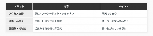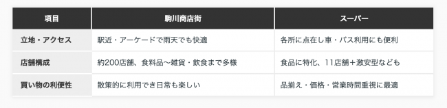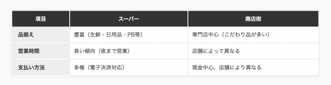 以下に、スーパーと商店街の比較をまとめた表をご覧ください。