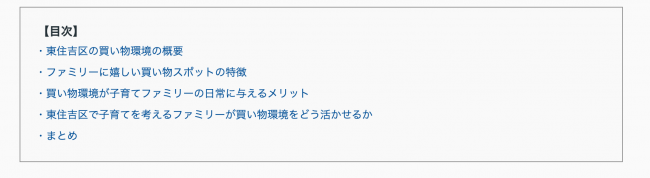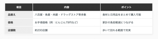 以下に、東住吉区の買い物環境の概要をファミリー視点で整理した表を示します。