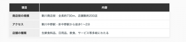 駒川商店街には、およそ十の商店会が参加し、全長およそ730メートル、東西約190メートル、南北約540メートルの十字形アーケードに、約200店の店舗が集合しています。商店街は生鮮食品や日用品、飲食店、サービス業など多様にそろっており、「なんでも揃う、値段が安い、買いやすい」と評判です。