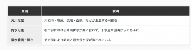 ただし、この浸水想定区域はあくまで「想定」であり、想定を超える豪雨の場合や地形・増水状況の変化などにより、実際の浸水範囲や深さが異なる可能性がある点にご注意ください。