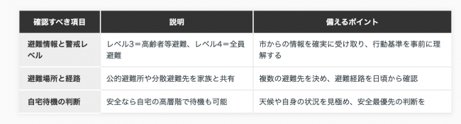 このように、警戒レベルの意味、避難先や経路の確認、自宅待機の条件をあらかじめ整理しておくことが、浸水時の安全行動に繋がります。