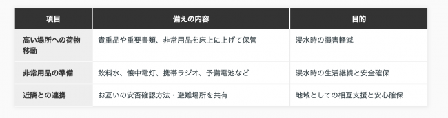 さらに、浸水が想定を超える場面に備えて、以下のような日頃からの備えも重要です:
