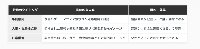 このように、事前の情報確認、大雨時の行動シミュレーション、日常備蓄、地域との連携といった取り組みを通じて、「いざ」というときにも冷静に、そして安全に行動できる準備ができます。