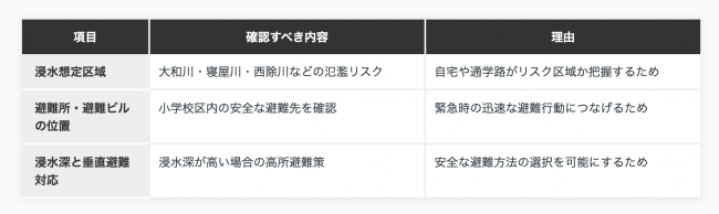 これらの家庭での準備を日常的に確認し、避難訓練なども通じて定着させておくことで、災害時の迅速かつ冷静な対応が可能になります。東住吉区の防災マップや小学校区の情報を活用して、ご家庭でもぜひ備えを進めてください。