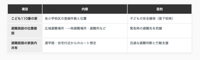 こうした情報をもとに、ご家庭で「お子さまが学校から帰る際、もしものときにはどこへ向かうか」「どの避難施設に向かうか」「避難経路はどうするか」といったシミュレーションをしておくことは、いざというときの迅速な判断につながります。特に、ハザードマップに示される浸水や水害リスクと避難施設の位置関係を確認しておくことで、避難先選びの判断がしやすくなります。