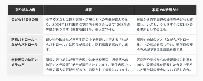 東住吉区では、通学時の子どもの安心を支えるために、「こども110番の家」の活用や地域による見守り活動が推進されています。以下は、取り組み内容を3つの主なポイントに整理した表です。
