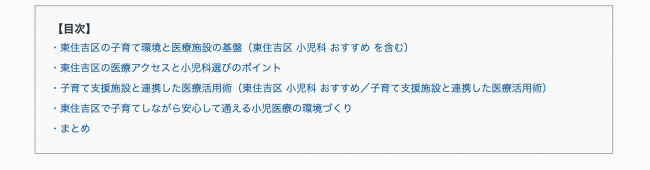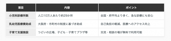 以下に、東住吉区の子育て環境と医療制度を簡潔に整理した表をご覧ください。
