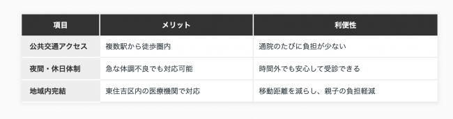このように、アクセスの良さと夜間・休日の診療体制が組み合わさっていることで、子どもが急に体調を崩したときや定期的な受診の際にも、親御さんは安心して医療機関を選びやすくなります。特に、東住吉区で子育てしながら通いやすい医療環境を重視する方には、この点が大きな安心材料となります。
