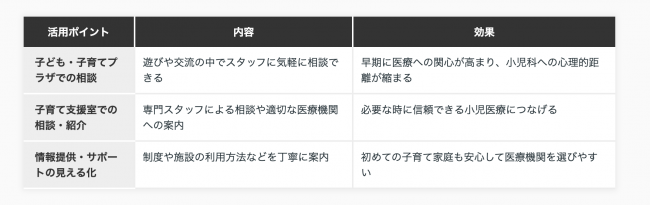 これらの支援施設の利用により、医療に対する不安が軽減され、信頼性や親しみやすさが高まります。結果として、子育て世帯が安心して通える小児医療の環境が整う大切な土台となります。