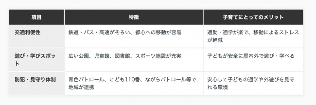 以下に、アクセス・遊び場、防犯体制の三点を表形式でまとめます。